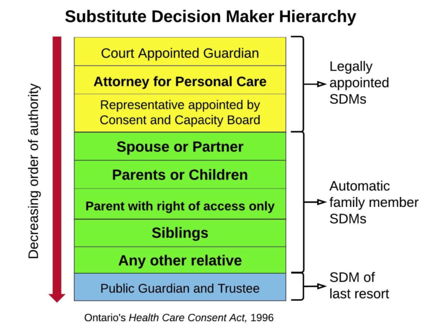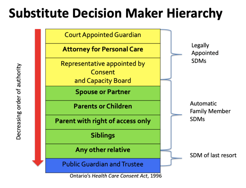 Every clinician in Ontario must know how to determine a person's SDM(s). In Ontario, every person has an automatic SDM outlined in the SDM Hierarchy of the Health Care Consent Act.